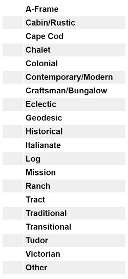 Many local buyers only search by the number of bedrooms, bathrooms, and price. One story versus two-story homes is not an architectural style but often comes up as a buyer style requirement.