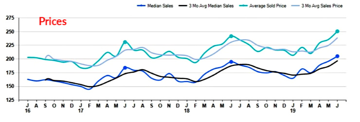 The median sale price rose +5.3% comparing June 2018 to June 2019. And comparing the average sale prices in the same timeframe +3.7%. And the average sale price rose a whopping +6.3% from May 2019.