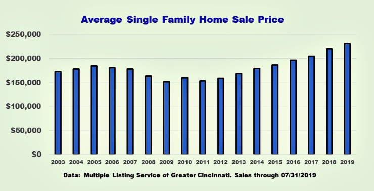 The average sale price for single-family homes in Greater Cincinnati is back to pre-bust levels. The average sale price for through the end of July is $232,086.