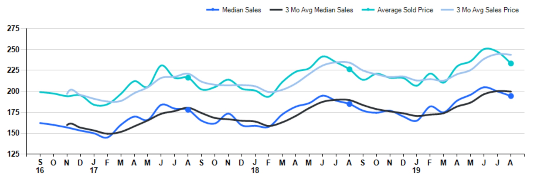 The median sale price rose +5.1% comparing August 2018 to August 2019. And comparing the average sale prices in the same timeframe +3.1%. However, the average sale price is down -5.6% from last month