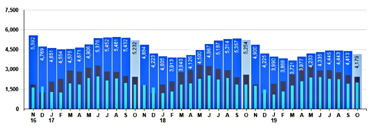 The median sale price rose +4.6% comparing October 2018 to October 2019 and down – 3.7% from last month.