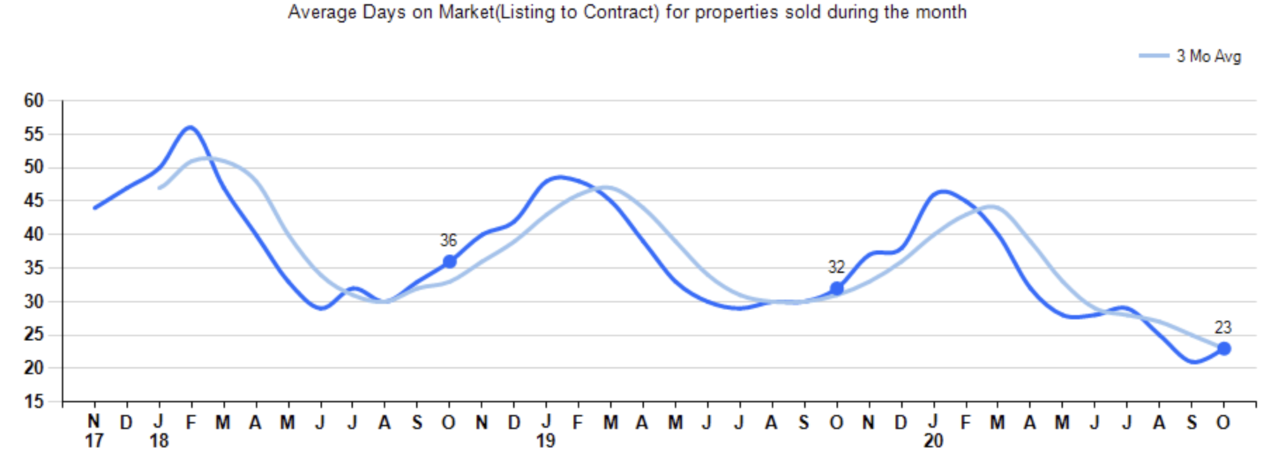 The Days on Market (DOM) for October was 23 days up +9.1% from last month. The October DOM was at its lowest level compared with October 2019 and 2018.