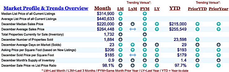 December Property sales were 1,884, up +12.3% from 1,678 in December of 2019 and -3.1% lower than the 1,944 sales last month. December 2020 sales were at their highest level compared to December of 2019 and 2018. December YTD sales of 23,598 are running +3.1% ahead of last year’s year-to-date sales of 22,899.