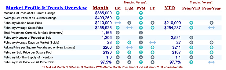 February Property sales were 1,206, down -14.4% from 1,409 in February of 2020 and -12.3% lower than the 1,375 sales last month. February 2021 sales were at their lowest level compared to February of 2020 and 2019. February YTD sales of 2,581 are running -1.4% behind last year’s year-to-date sales of 2,617.