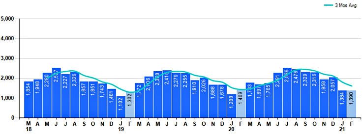 February Property sales were 1,390, down -1.3% from 1,409 in February of 2020 and 0.4% higher than the 1,384 sales last month. February 2021 sales were at a mid-level compared to February 2020 and 2019. February YTD sales of 2,774 are running 6.0% ahead of last year’s year-to-date sales of 2,617.