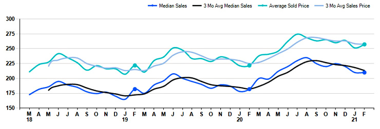 The Median Sales Price in February was $210,000, up 15.4% from $182,000 in February of 2020 and equal to $210,000 last month. The Average Sales Price in February was $257,366, up 16.0% from $221,862 in February of 2020 and up 2.4% from $251,331 last month. February 2021 ASP was at the highest level compared to February 2020 and 2019.