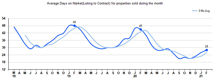 The average Days On Market(DOM) shows how many days the average Property is on the Market before it sells. An upward trend in DOM tends to indicate a move towards more of a Buyer’s market, a downward trend a move towards more of a Seller’s market. The DOM for February was 28, up 7.7% from 26 days last month and down -37.8% from 45 days in February of last year. The February 2021 DOM was at its lowest level compared with February 2020 and 2019.