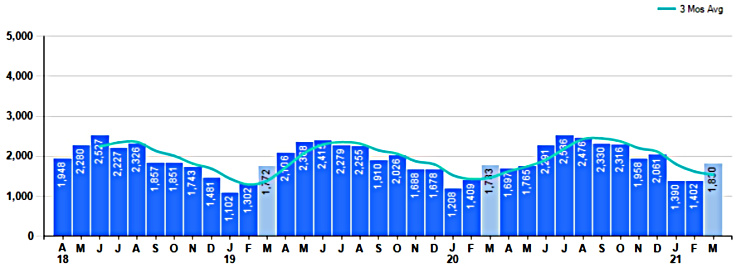 March Property sales were 1,830, up 2.6% from 1,783 in March of 2020 and 30.5% higher than the 1,402 sales last month. March 2021 sales were at their highest level compared to March of 2020 and 2019. March YTD sales of 4,622 are running 5.0% ahead of last year’s year-to-date sales of 4,400.