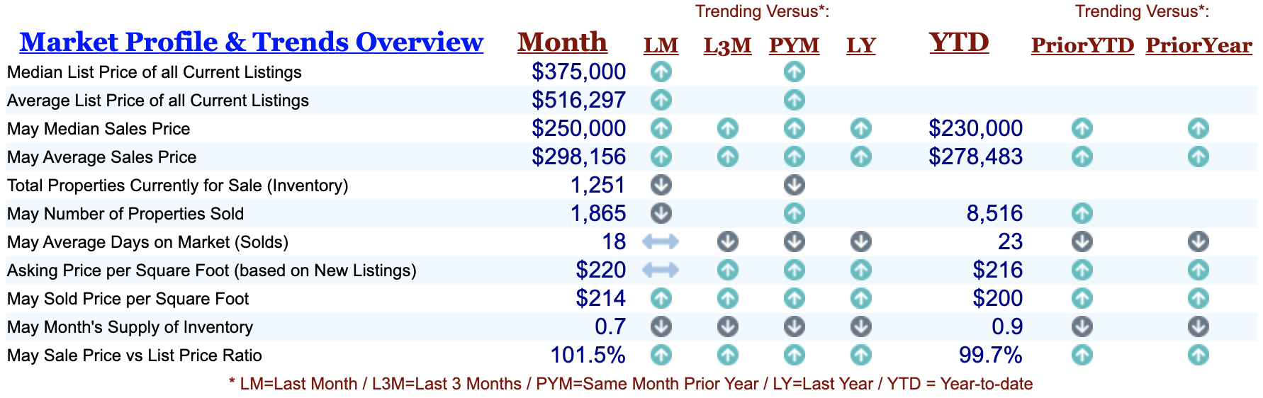May Property sales were 1,865, up 5.7% from 1,765 in May of 2020 and -6.3% lower than the 1,991 sales last month. May 2021 sales were at a mid-level compared to May of 2020 and 2019. May YTD sales of 8,516 are running 8.3% ahead of last year’s year-to-date sales of 7,862