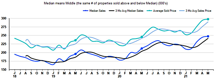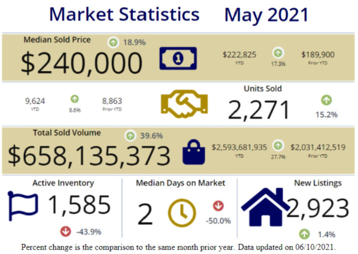 The Median Sales Price in May was $247,500, up 16.7% from $212,000 in May of 2020 and up 1.0% from $245,000 last month. The Average Sales Price in May was $297,716, up 21.0% from $245,955 in May of 2020 and up 1.1% from $294,499 last month. May 2021 ASP was at the highest level compared to May 2020 and 2019.