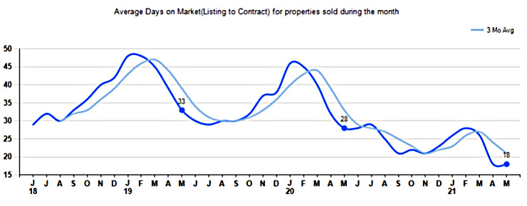 The average Days On Market(DOM) shows how many days the average Property is on the Market before it sells. An upward trend in DOM tends to indicate a move towards more of a Buyer’s market, a downward trend a move towards more of a Seller’s market. The DOM for May was 18, equal to 18 days last month and down -35.7% from 28 days in May of last year. The May 2021 DOM was at its lowest level compared with May of 2020 and 2019.