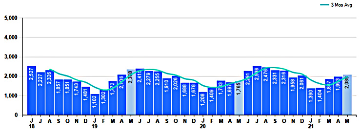 May Property sales were 2,089, up 18.4% from 1,765 in May of 2020 and 4.8% higher than the 1,993 sales last month. May 2021 sales were at a mid-level compared to May of 2020 and 2019. May YTD sales of 8,743 are running 11.2% ahead of last year’s year-to-date sales of 7,862.