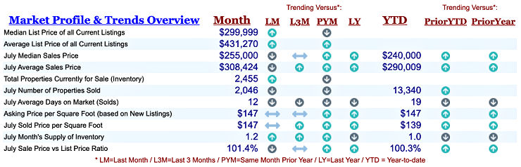 July Property sales were 2,046, down -19.0% from 2,526 in July of 2020 and -19.2% lower than the 2,531 sales last month. July 2021 sales were at their lowest level compared to July of 2020 and 2019. July YTD sales of 13,340 are running 6.3% ahead of last year’s year-to-date sales of 12,553.