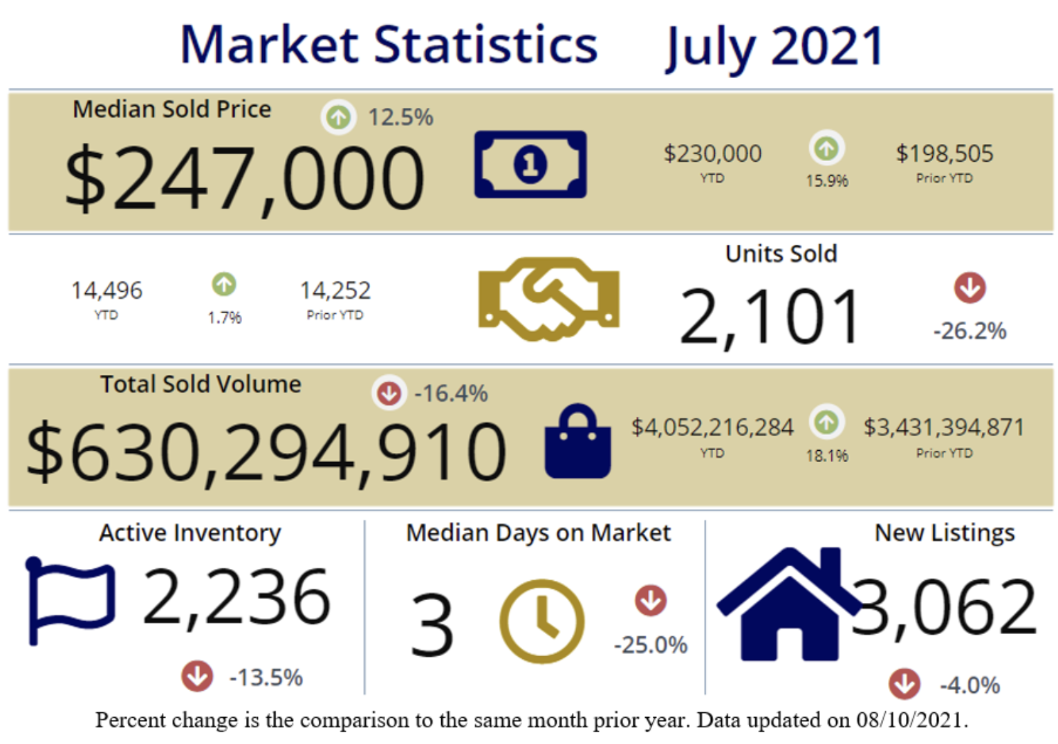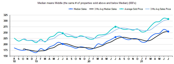 The Median Sales Price in July was $255,000, up 10.4% from $231,000 in July of 2020 and down -3.4% from $264,000 last month. The Average Sales Price in July was $308,287, up 12.0% from $275,342 in July of 2020 and down -1.2% from $311,997 last month. July 2021 ASP was at the highest level compared to July 2020 and 2019.