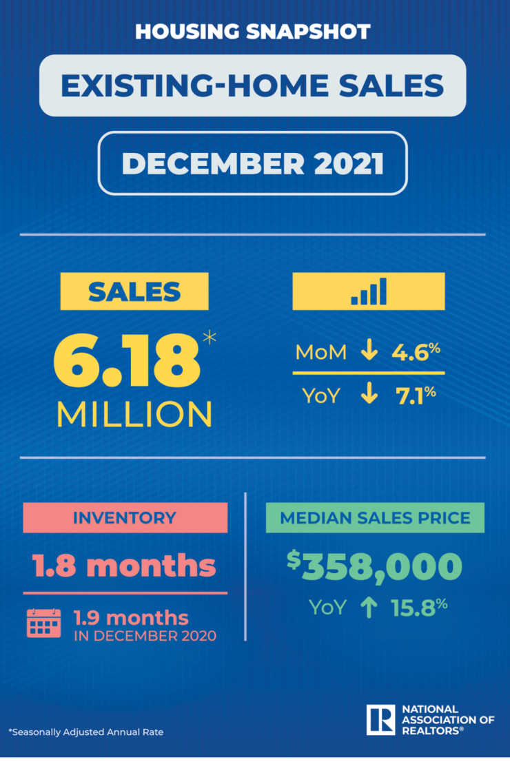 NAR reports: “December 2021 brought 6.18 million in sales, a median sales price of $358,000, and 1.8 months of inventory. The median sales price is up 15.8% year-over-year, and inventory was down 0.1 months from December 2020.”