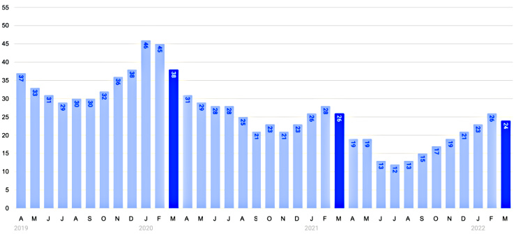The March 2022 DOM was at its lowest level compared with March 2021 and 2020.