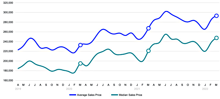The average sales price in March 2022 was $293,009, up 3.23% from $283,848 in the previous month and 9.61% higher than $267,311 in March 2021.