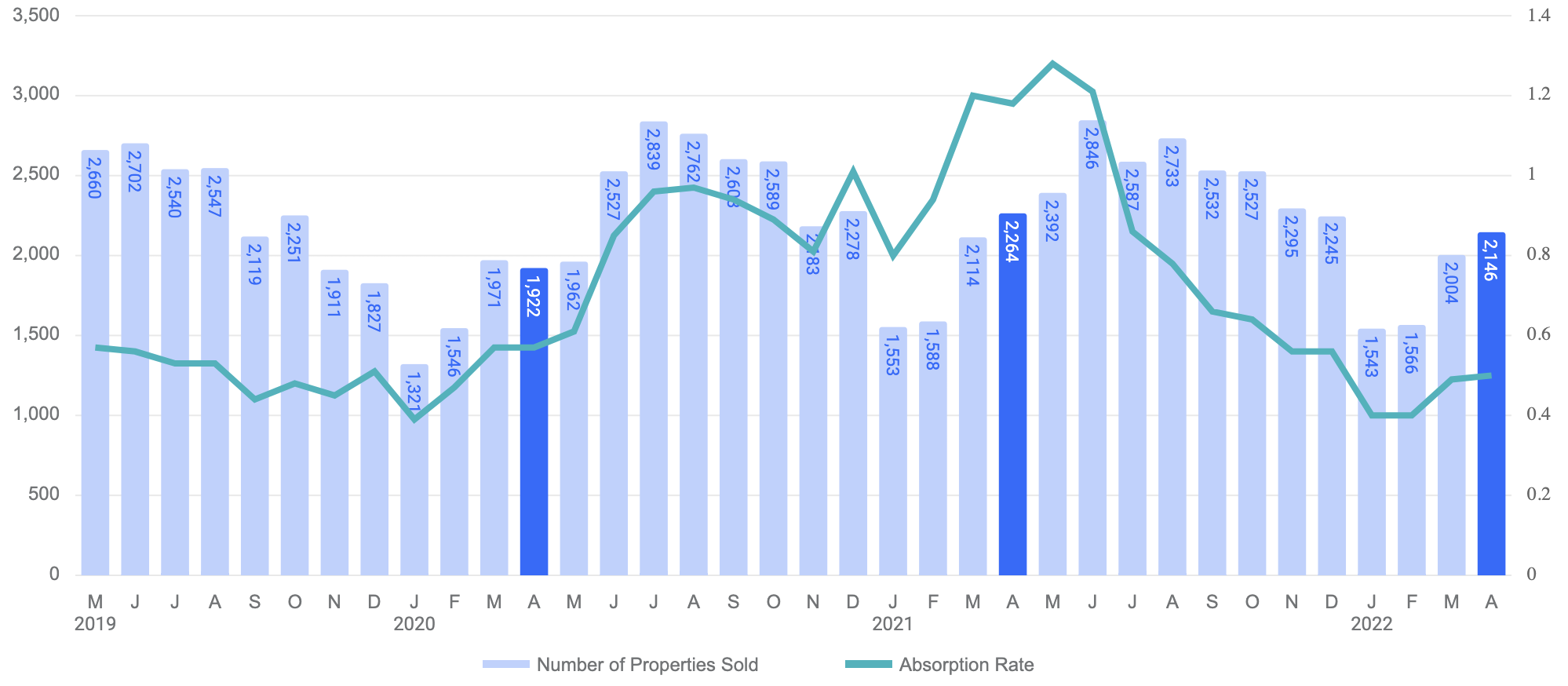 The April 2022 sales were at a mid-level compared to April 2021 and 2020. The absorption rate is the avg number of sales per month divided by the total number of available properties.