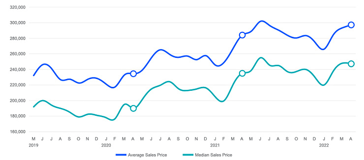 The average sales price in April 2022 was $297,193, up 1.32% from $293,323 in the previous month and 4.60% higher than $284,115 in April 2021. The April 2022 average sale price was at its highest level compared to April 2021 and 2020.
