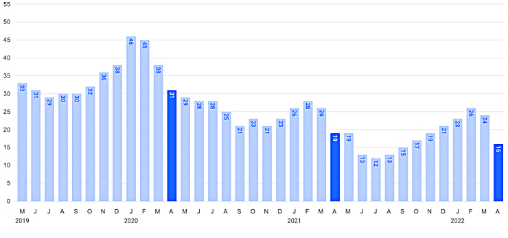 The DOM for April 2022 was 16 days, down -33.33% from 24 days from the previous month and -15.79% lower than 19 days from April 2021. The April 2022 DOM was at its lowest level compared with April 2021 and 2020.