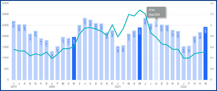The number of properties sold in May 2022 was 2,431, up 10.85% from 2,193 in the previous month and 1.63% higher than 2,392 in May 2021. The May 2022 sales were at their highest level compared to May 2021 and 2020. The absorption rate is the avg number of sales per month divided by the total number of available properties.