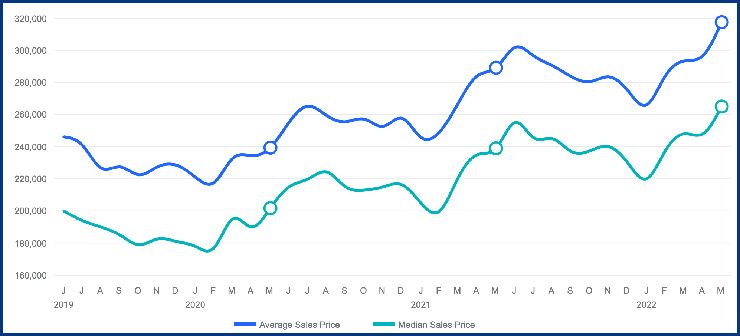 The median sales price in May 2022 was $265,000, up 6.85% from $248,000 in the previous month and 10.88% higher than $239,000 in May 2021. The May 2022 median sales price was at its highest level compared to May 2021 and 2020. The average sales price in May 2022 was $317,505, up 7.03% from $296,643 in the previous month and 9.81% higher than $289,150 in May 2021. The May 2022 average sale price was at its highest level compared to May 2021 and 2020.