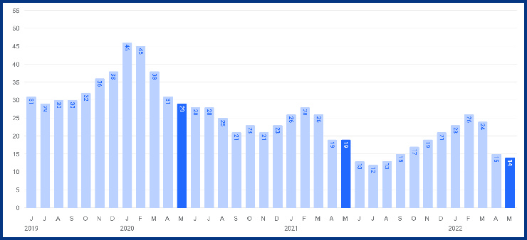 The average days on market (DOM) is the number of days a property is on the market before it sells. An upward trend in DOM tends to indicate a move towards a buyer’s market, and a downward trend tends to indicate a move towards a seller’s market. The DOM for May 2022 was 14 days, down -6.67% from 15 days from the previous month and -26.32% lower than 19 days from May 2021. The May 2022 DOM was at its lowest level compared with May 2021 and 2020