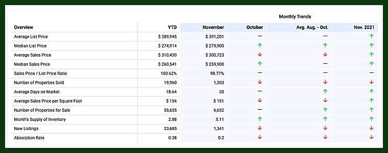 The chart below shows real estate activity for November 2022 compared to the same timeframe in 2021.