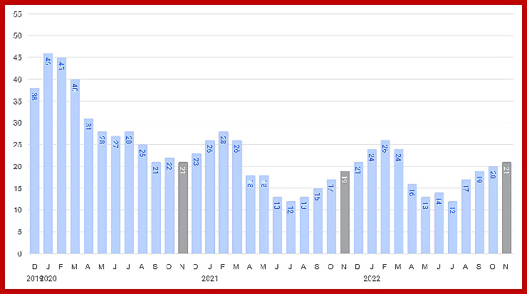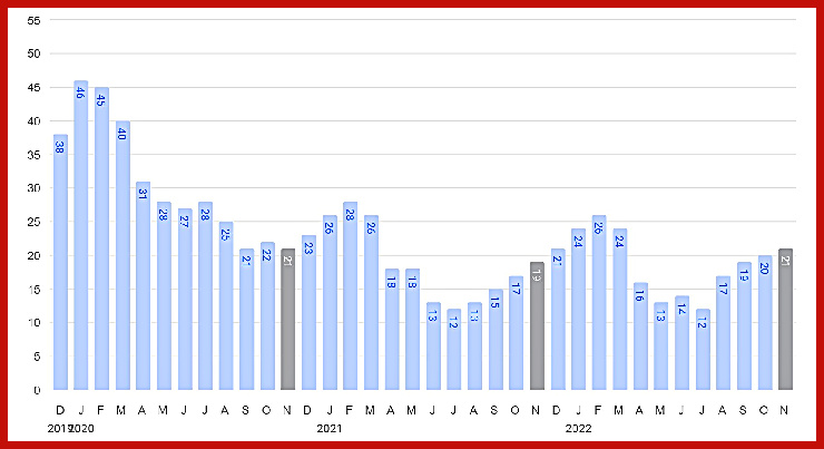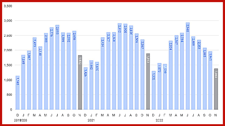The overview below shows real estate activity from January 2022 to November 2022. You will see data comparisons between November and the previous month, the last three months, and November 2021.