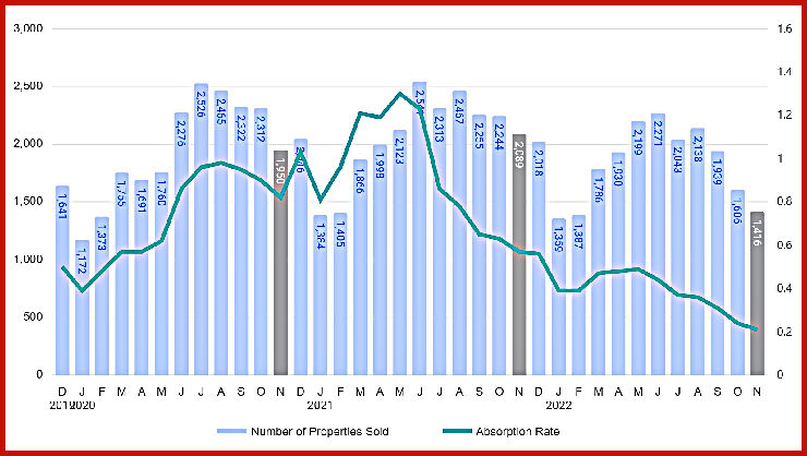 The number of properties sold in November 2022 was 1,416, down -11.83% from 1,606 from the previous month and -32.22% lower than 2,089 from November 2021. The November 2022 sales were at their lowest level compared to November 2021 and 2020. The absorption rate is the avg number of sales per month divided by the total number of available properties.