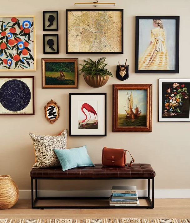 Gallery walls aren’t just for art – they’re also great for showcasing special mementos or knick-knacks too. Think of it as a way to tell your story: you can use frames to display vintage postcards, tickets from concerts, pressed flowers – anything that has meaning for you. Simply look around your home and pick out pieces that have personal significance. Then, decide how you want to group them together – perhaps create a separate vignette to the side of your gallery wall or arrange them amongst your existing artwork.