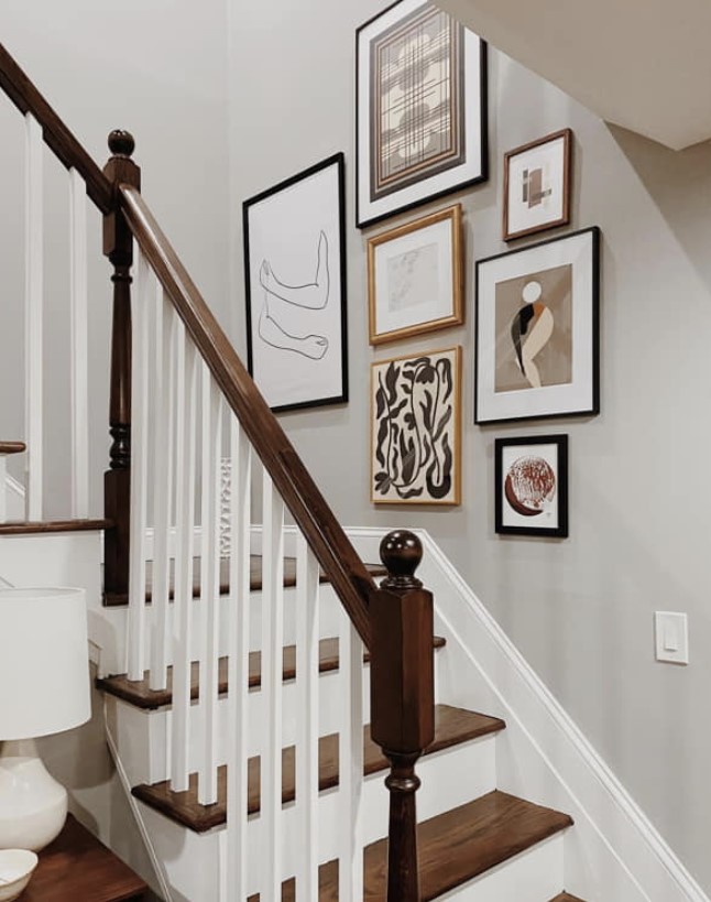 Create your own gallery wall near or below your staircase. This will help create a focal point and add visual interest to your home. Consider choosing a theme to make the look cohesive, such as family photos or meaningful artwork.