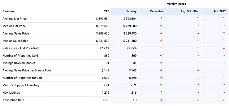 The January 2023 median sales price was at its highest level compared to January 2022 and 2021. The average sales price in January 2023 was $288,430, down -1.76% from $293,605 from the previous month and 4.54% higher than $275,895 from January 2022.