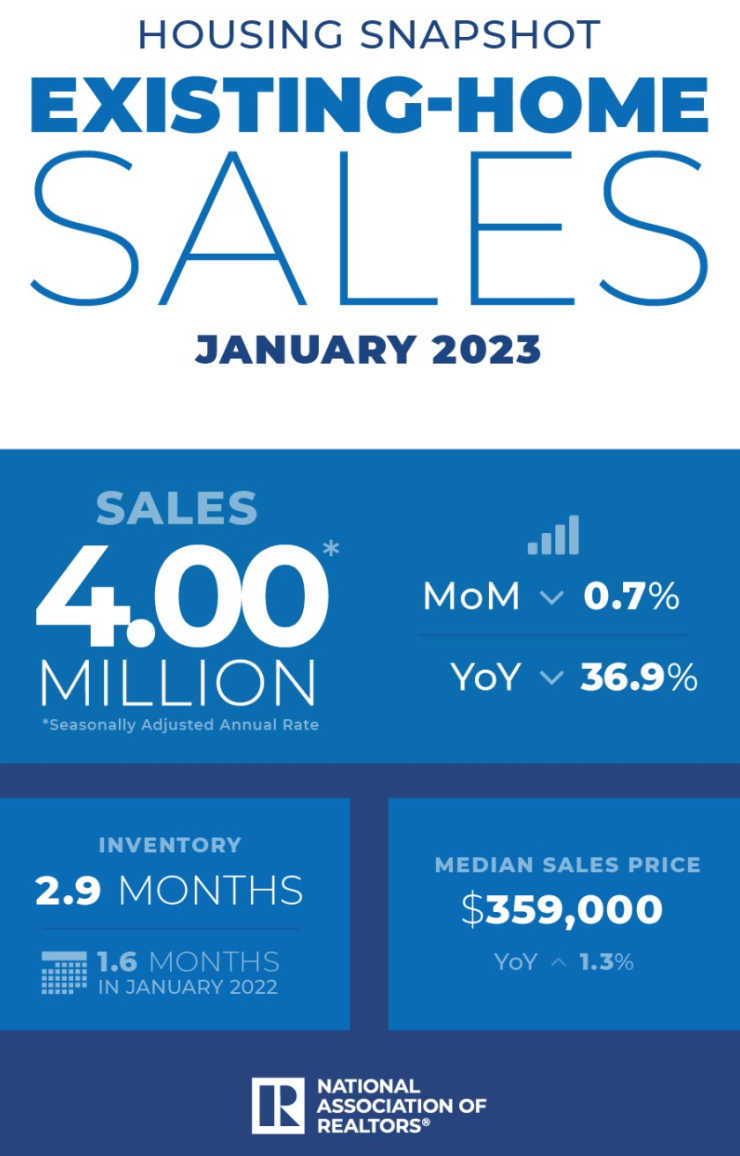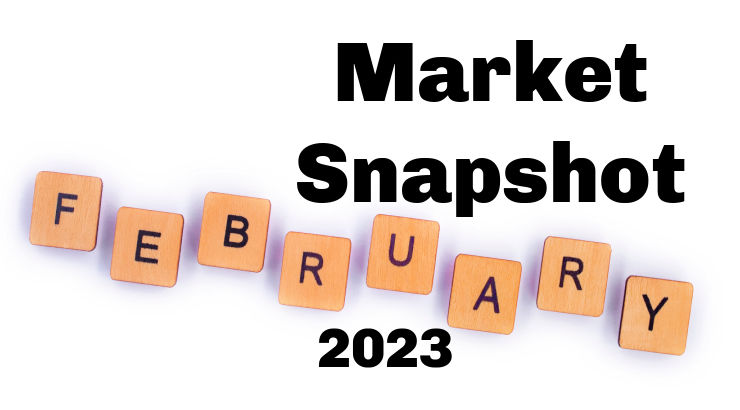 The overview below shows real estate activity from January 2023 to February 2023. You will see data comparisons between February and the previous month, the last three months, and February 2022.