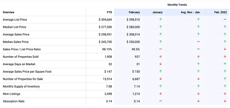 The February 2023 median sales price was at its highest level compared to February 2022 and 2021. The average sales price in February 2023 was $308,014, up 6.25% from $289,888 from the previous month and 4.74% higher than $294,074 from February 2022.