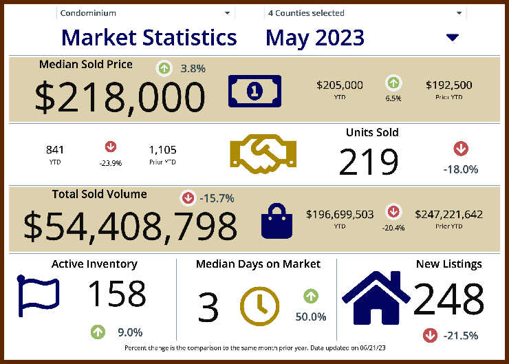Below is the infographic summarizing condo sales in Butler, Clermont, Hamilton, and Warren counties through the end of May 2023: