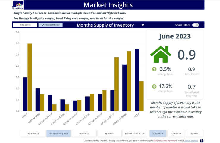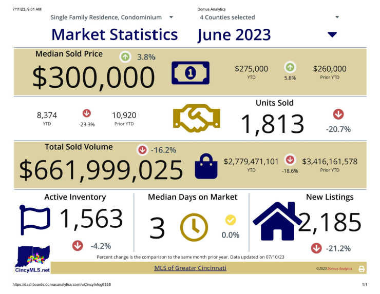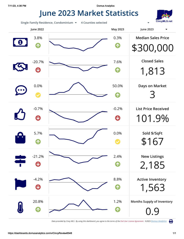 “Hamilton, Butler, Clermont, and Warren Counties’ home sales were up +7.6% in June 2023 from May 2023 but were down -20.7% compared to June 2022.”