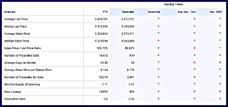 The average sales price in December 2023 was $373,511, up 12.25% from $332,735 from the previous month and 27.76% higher than $292,352 from December 2022.