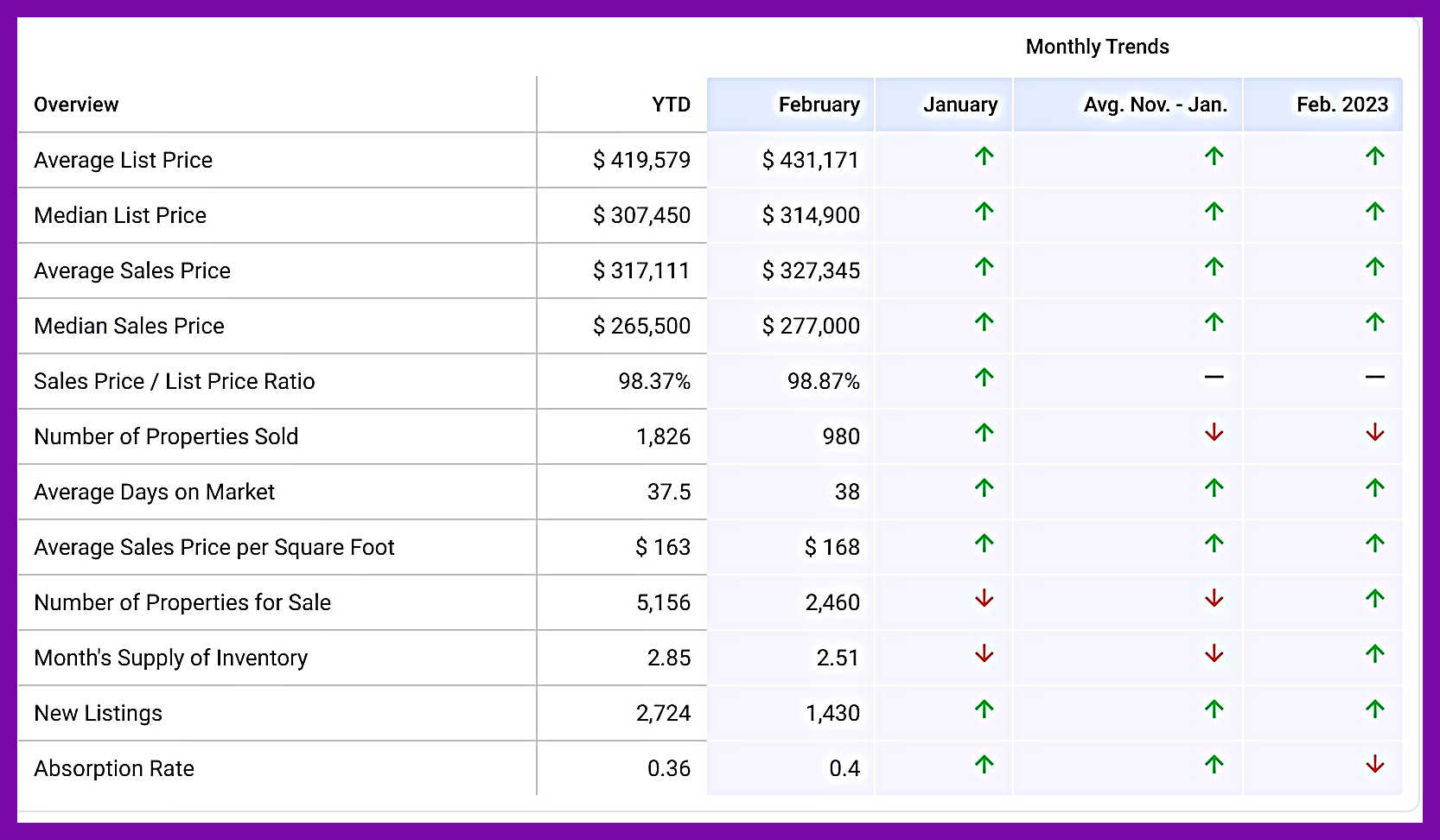 The February 2024 median sales price was at its highest level compared to February 2023 and 2022. The average sales price in February 2024 was $327,345, up 6.67% from $306,877 from the previous month and 5.33% higher than $310,790 from February 2023.