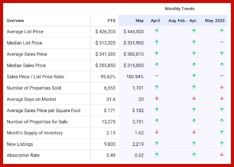 The overview below shows real estate activity from January 2024 to May 2024. You will see data comparisons between May and the previous month, the last three months, and May 2023.