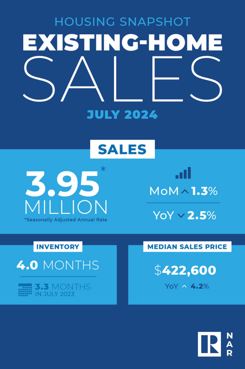 July 2024 brought 3.95 million in sales, a median sales price of $422,600, and 4.0 months of inventory.