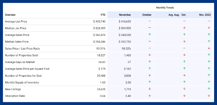 The November 2024 median sales price was at its highest level compared to November 2023 and 2022. The average sales price in November 2024 was $363,546, up 4.54% from $347,744 from the previous month and 6.95% higher than $339,926 from November 2023.