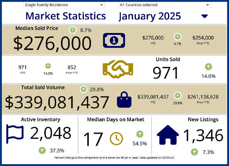 The Cincinnati MLS publishes lots of statistics. This one is a bird’s eye view of the January 2025 activity. As you can see everything is up including days on the market and good news- active number of homes listed.