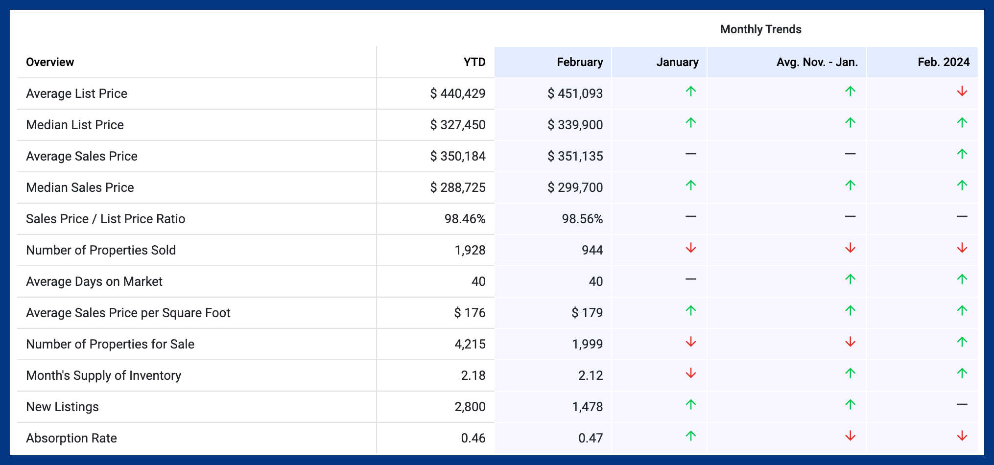 The overview below shows real estate activity from January 2025 to February 2025. You will see data comparisons between February and the previous month, the last three months, and February 2024.