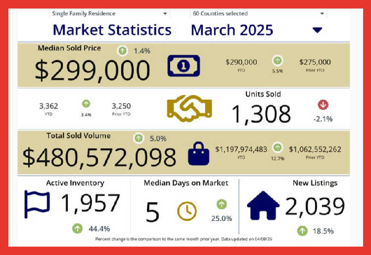 The median sales price in March 2025 was $300,000, which is equal to the previous month and 1.35% higher than the $296,000 recorded in March 2024.