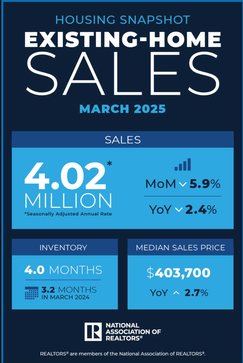 - Existing-home sales slipped 5.9% in March to a seasonally adjusted annual rate of 4.02 million.