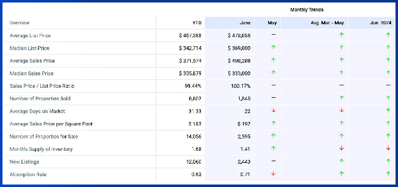 The June 2025 median sales price was at its highest level compared to June 2024 and 2023. The average sales price in June 2025 was $408,288, up 5.34% from $387,575 from the previous month and 8.66% higher than $375,732 from June 2024.