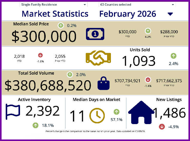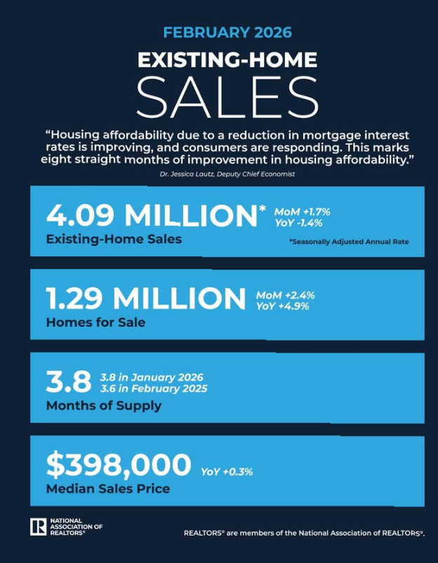 February 2026 brought 4.09 million in sales, a median sales price of $398,000, and 3.8 months of inventory. The median sales price is up 0.3% year-over-year, and inventory was up 0.2 months from February 2025.